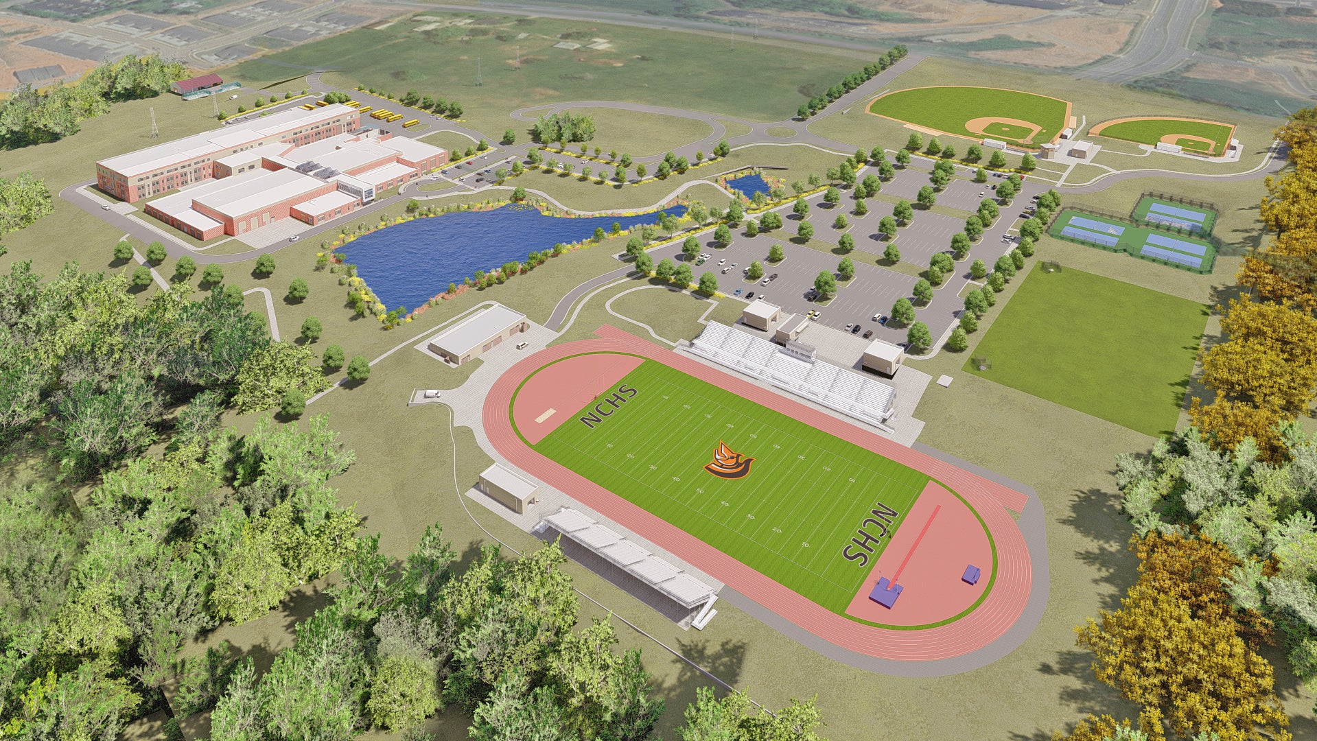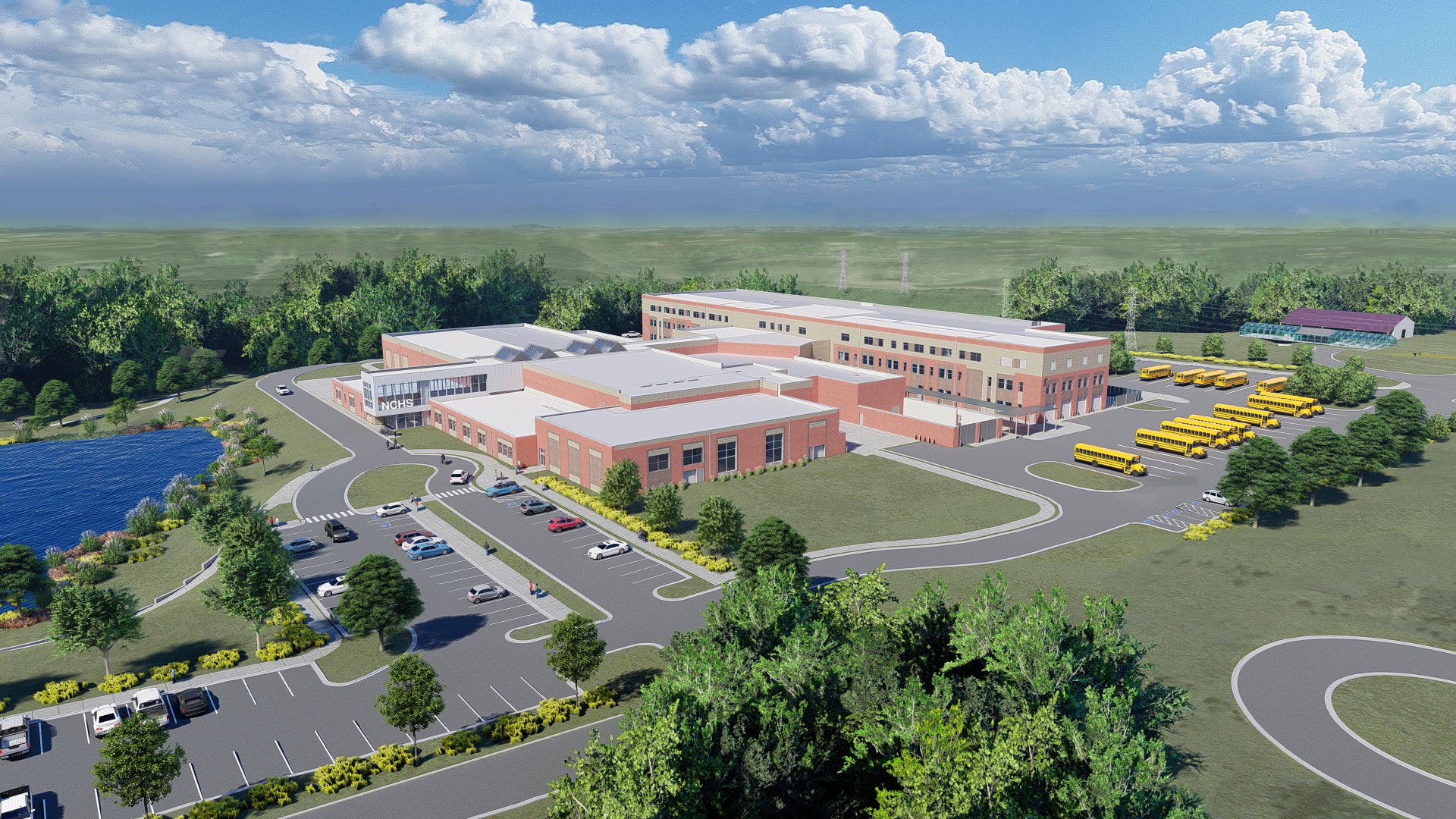 Athletics and extracurricular programs are supported by a fully integrated sports complex featuring a 4,000-seat football stadium with practice facilities, baseball and softball fields, and a six-court tennis complex. Site planning prioritizes safe, efficient circulation by separating bus, parent, service, and pedestrian traffic while maintaining strong connections between academic, athletic, and outdoor spaces.