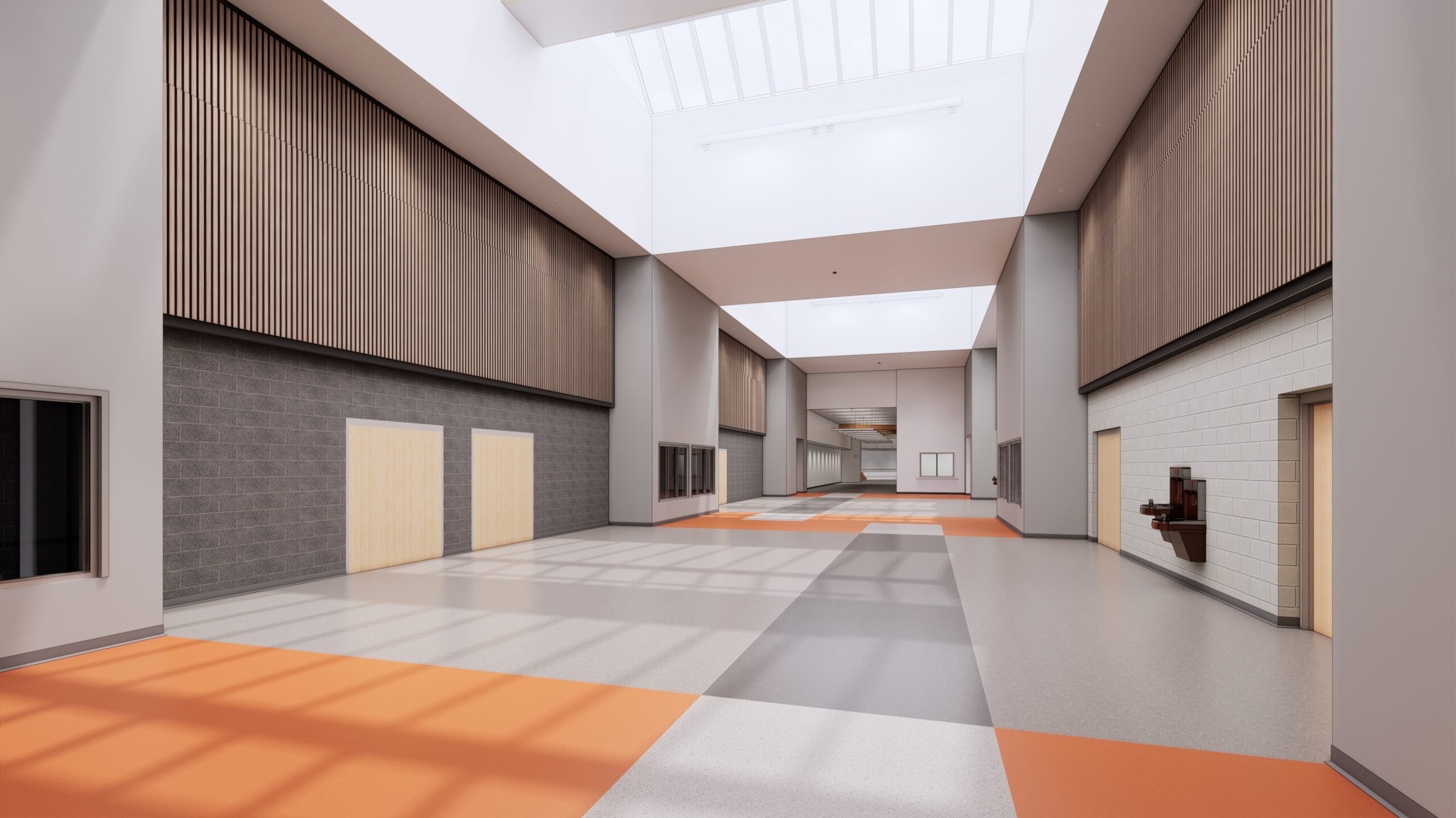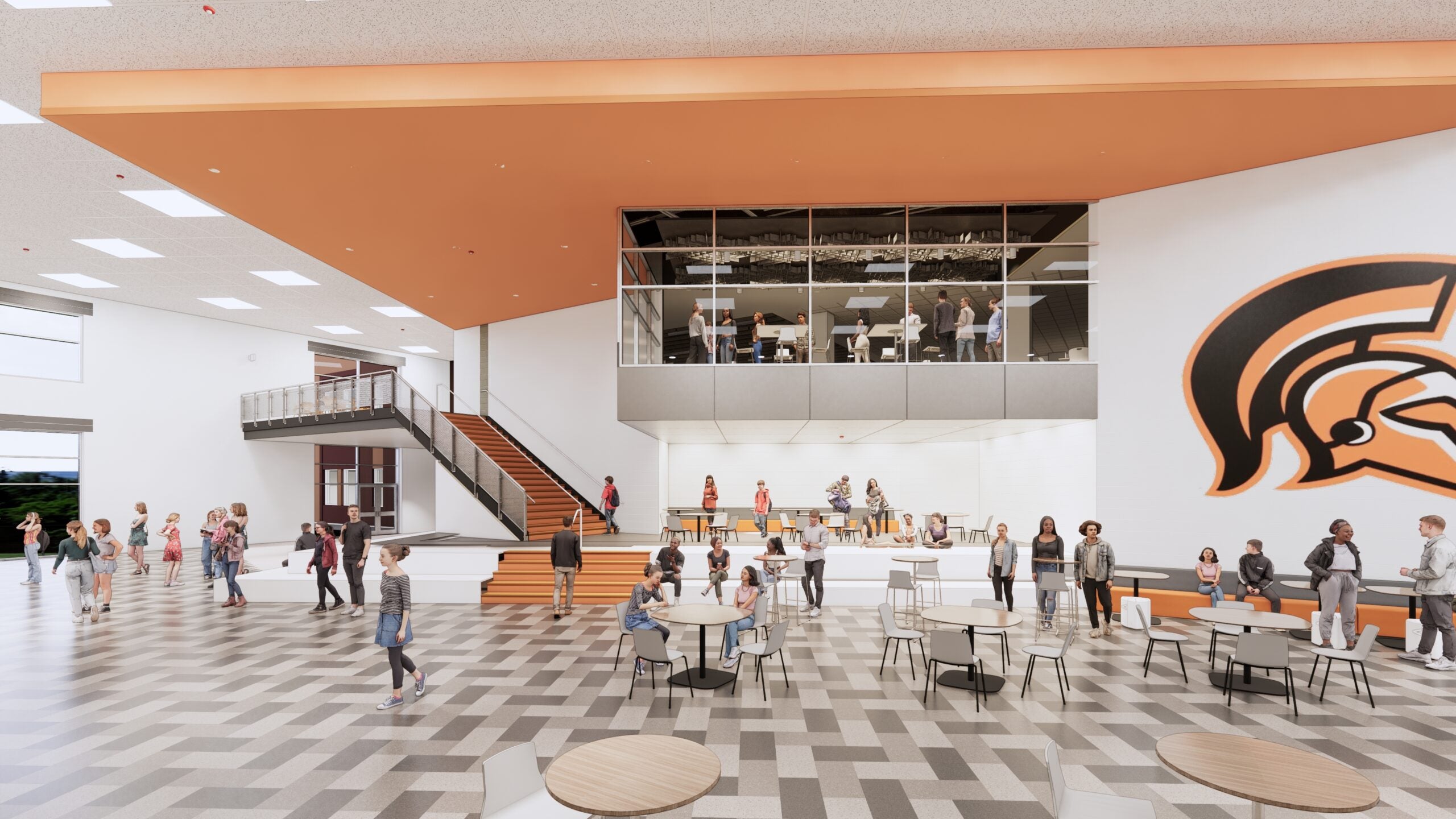The academic building is organized around a central, daylit student commons—Trojan Square—which serves as the social and organizational heart of the school. This shared space supports student dining, informal learning, and large gatherings while providing intuitive wayfinding and strong visual connections throughout the building. Academic wings extend from the commons, allowing classrooms and support spaces to be clearly zoned while maintaining connectivity and supervision.